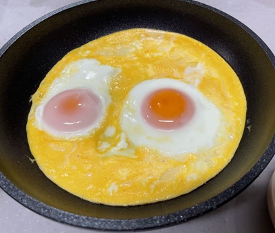 卵をひとつ混ぜておき、フライパンに卵をひとつ落とす。
